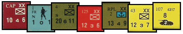 The components are average for a mid-1980’s game. The map is functional, legible and without any significant discrepancies or misprints. The pieces are colored such that it is quite easy to distinguish between U.S., U.N., South Korean, North Korean, Russian, Nationalist Chinese and Communist Chinese units. The pieces are also quite durable. (I once accidentally spilled an entire glass of iced tea into the counter tray; I then towel dried the counters, separated them and let them air dry for 24 hours… they’re as good as new). Two informational inserts contain most of the commonly used charts for easy reference, as well as including them on the game maps themselves (i.e. combat charts, etc.). I doubt the game map would stand up to the “iced tea” test, but one wouldn’t expect that level of durability from a paper game map anyway.