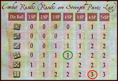 The red die is cross-referenced with the number of English strength points involved in the combat to arrive at the total number of strength point losses inflicted on the Indians. The green die is cross-referenced with the number of Indian strength points present to figure the number of strength point losses inflicted on the English.