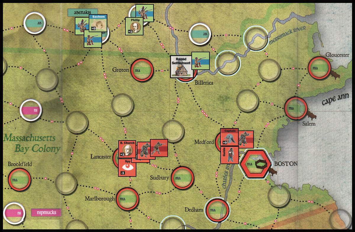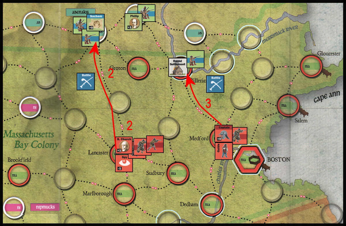 - The Massachusetts Captain in Medford takes his company and spends the 3 movement points required to place a Battle Marker on the Indian War Band in the razed settlement of Billerica. Note that, if Church was not yet in the game, the English would not be able to make this move because it is a 3-pip crossing and they are limited to 1-pip crossings until Church arrives.