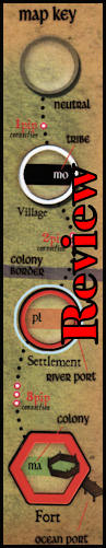 The board game map shows game “spaces” to regulate movement which may represent Indian villages, English settlements, or just plain open or neutral spaces. Black dotted lines connect the spaces, but near the center of each line a string of 1, 2 or 3 colored “pips” appear and indicate the actual movement point cost to cross. I have not seen this mechanism in other games and I thought it was a really handy way of managing the various movement point costs. I find it preferable to having to lookup terrain movement point costs or having to remember the value of color coded connector lines.