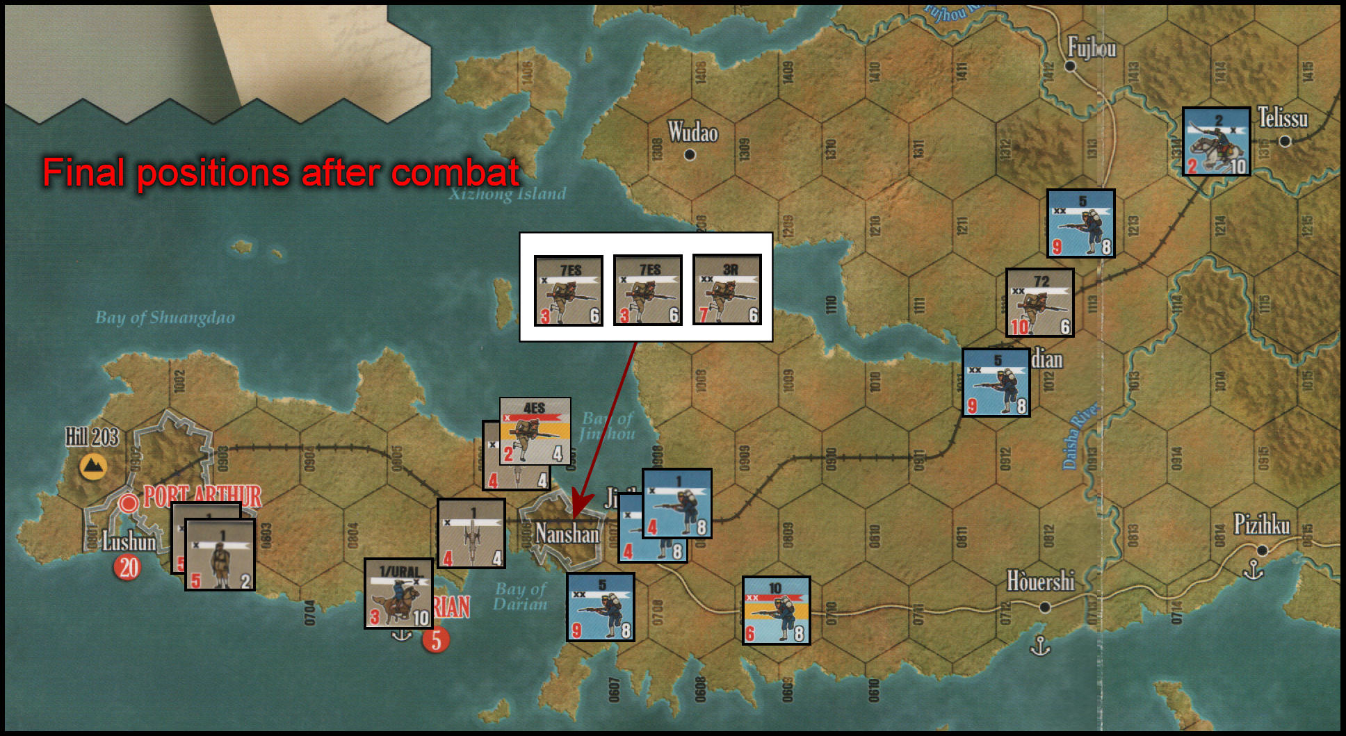 During his Reinforcement Phase, the Japanese player has landed a 9-8 division in the port town of Pizihku (hex 0814), to augment the infantry and cavalry units already present in and adjacent to the port town of Houérshi (hex 0712). Several other Japanese units have been trying, without must success, to assault the fortress of Nanshan. In the prior turn, the Russian player sent reinforcements down the railroad to threaten Japanese supply lines, so the Japanese player must respond.