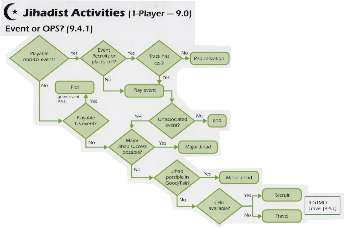 - First and foremost, US event cards from the Jihadist hand are never executed. This, in my opinion, is the biggest advantage granted the Jihadist. When the US player plays an operations card that contains a Jihadist event, however, it must still be executed as in the 2-player game.