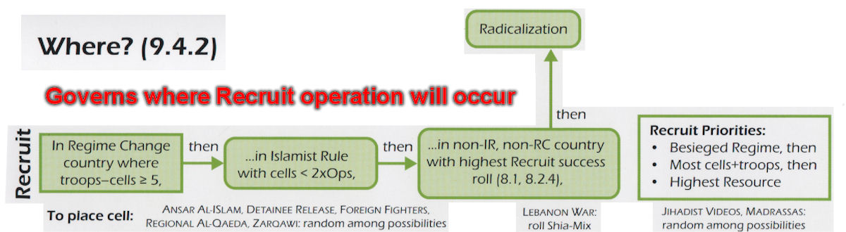 Note that these four Radicalization possibilities are evaluated from top to bottom for all unspent operations points. Let’s consider as an example that the selected Jihadist card is an unplayable 3 point Jihadist event, and that the main flowchart directs you to the “Recruit” operation. There are, however, no cells remaining on the Funding Track, and therefore no cells can be recruited. The “Recruit” sub-flowchart directs us to Radicalization where the following evaluations and actions take place:
