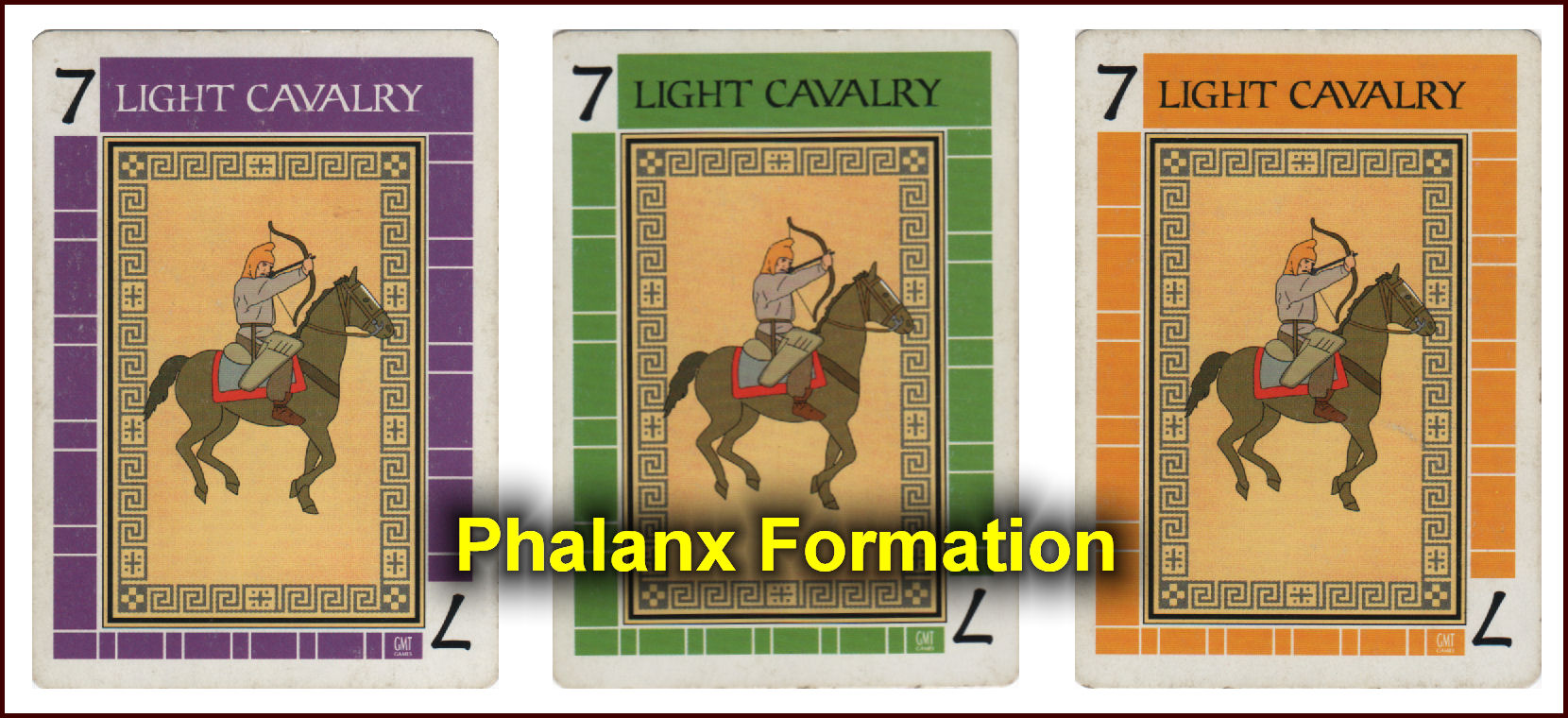 Battle Line Card Game Phalanx Formation #2 – Phalanx: Three cards of the same value (Poker equivalent: three of a kind).