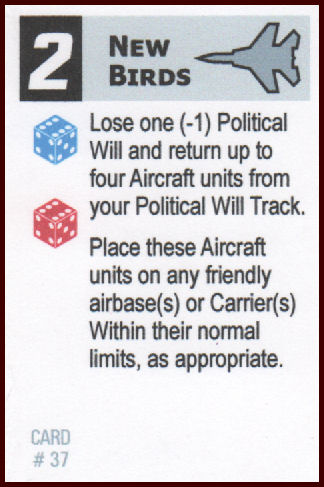 The Victory conditions are unique and integrate well with the game. I like the idea that you can make trade-offs that will increase your combat strength for a cost in Political Will. It’s up to you to decide the best course of action at any given moment. For example, the New Birds Activity Card can be played to allow a player to resurrect four eliminated aircraft units at a cost of -1 Political Will. If the extra combat power will give you the extra punch you need to eliminate enough enemy units to push them past their Political Will threshold, you’ll have the option to take that approach.