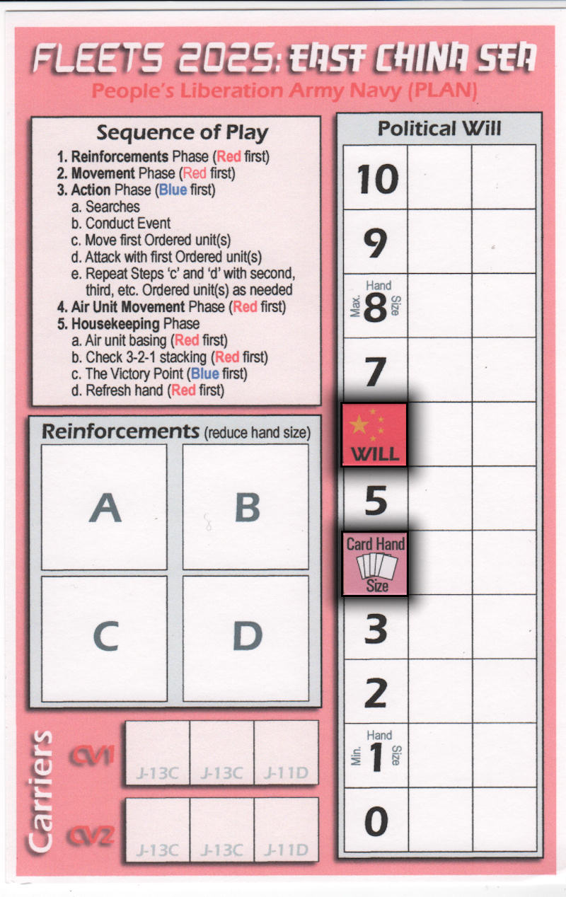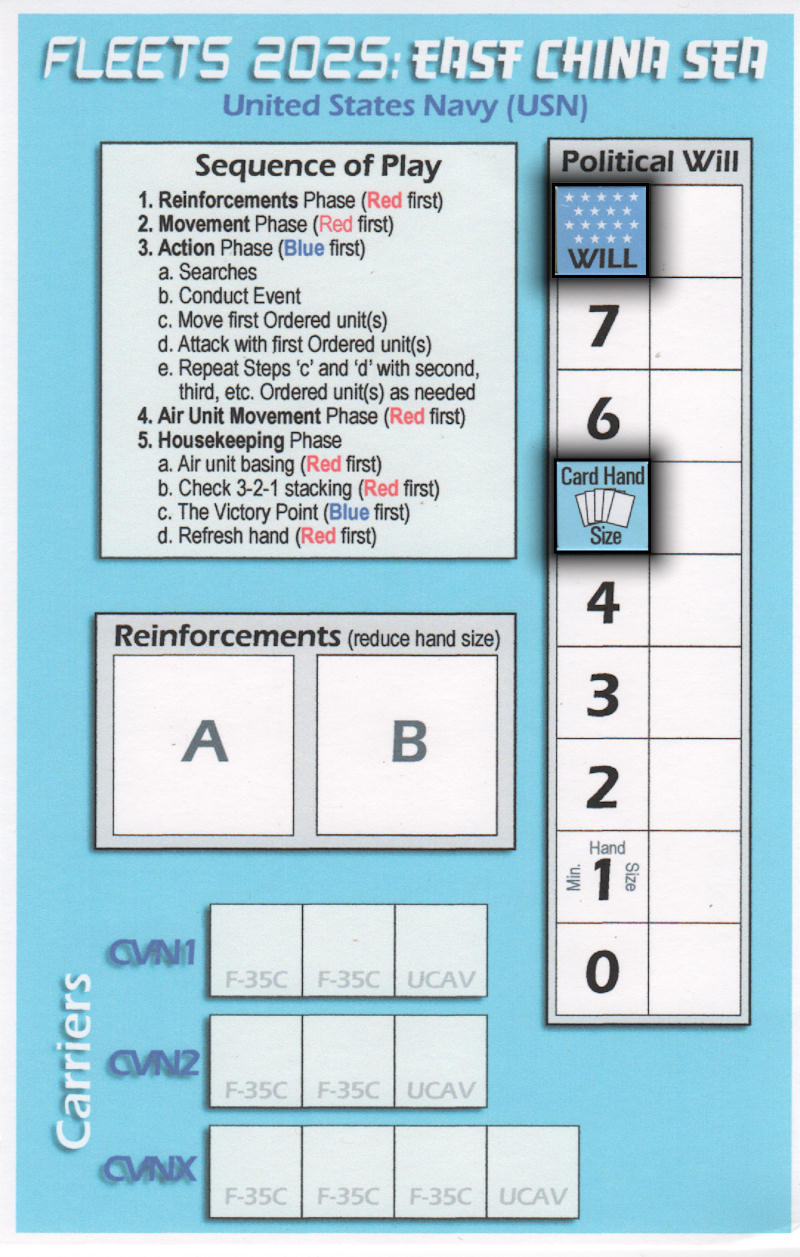 - Political Will – As your units are elminated in combat, you place them on your Political Will Track, starting at the bottom right of the grid and working towards the top left. Each eliminated unit fills one box on the Political Will track, except for Carriers which fill an entire row! This simple rule makes the carriers as important in the game as they are in the real world. When your casualties fill up the Political Will track such that they reach the Political Will marker, you lose the game.