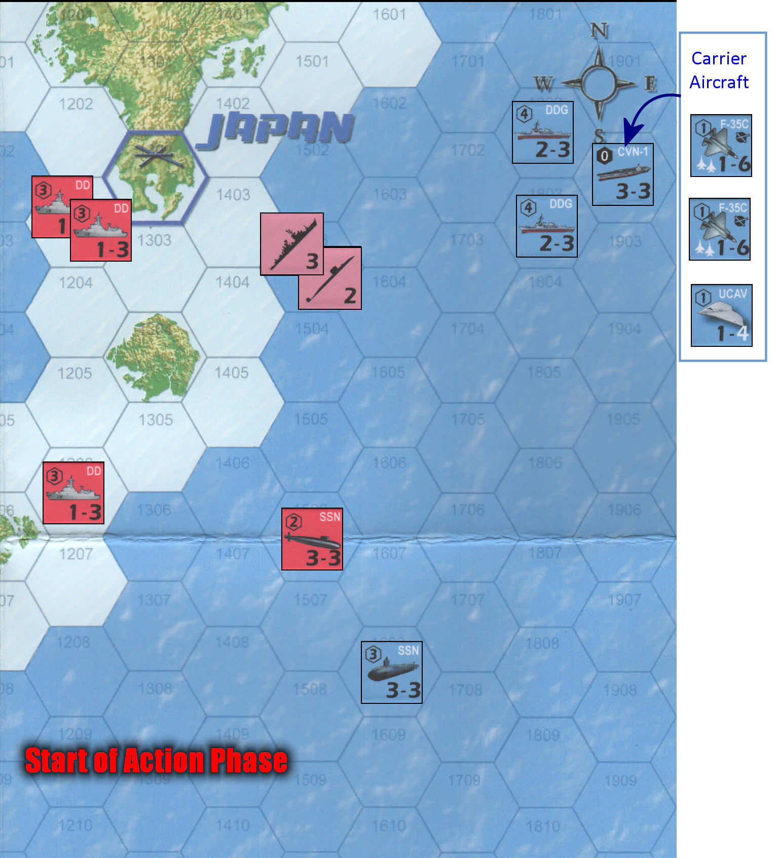 The following graphics show a very basic example of an Action Phase. For purposes of this example, we are assuming that all units have been detected, except for one Chinese surface ship and one Chinese submarine unit. The U.S. player plays first in the Action Phase.