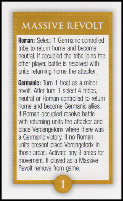 The last thing I want to discuss is the Massive Revolt. Remember, even if you don’t draw this card normally, you will be able to put it into your hand if and when the Romans acquire 13 tribes. The Germanic player should avoid the temptation to play this card too early (in fact, you cannot play it on the first turn). In practice you’ll want to wait until at least 54 BC (turn 5) so that you don’t give the Roman player too much time to re-conquer those tribes.