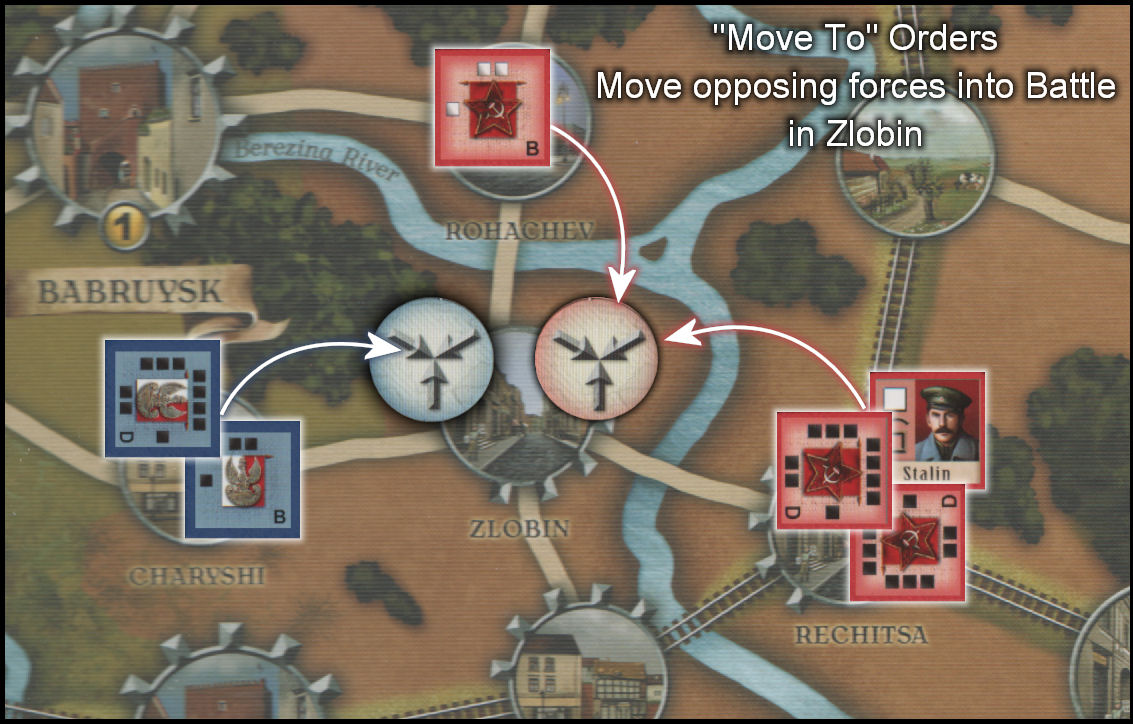 In brief, Forced March Out and Move Out orders are placed on a space with friendly units and activate all units in the space to march out in any direction. Infantry move 1 space, cavalry moves 2 spaces and a Forced March Order gives each unit type an additional space to move. Move To and Forced Marches To orders are placed on any space with the requirement that units following these orders end their movement in the target space. Withdrawal orders lets you retreat if your units are attacked at the cost of one strength point lost. Defend orders allow friendly units to ignore the first loss in combat and negates one enemy flanking attack. Units gain one strength point under a Reorganize order but they may not move and fight at half combat strength rounded down if attacked. The Rail Transport order allows units to move along a friendly rail line up to eight spaces. Finally, the Recon order is a mandatory order that must be placed in each operations phase and allows you to look at enemy unit strengths. However, since it can be placed within three hexes of a friendly unit, it is sometimes best utilized as a crafty misdirection by placing it on a friendly or unoccupied space to make your opponents think that some other order will be executed there.