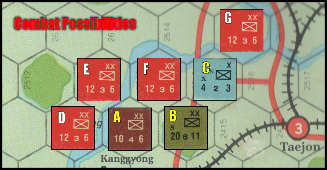 If US division “B” is the activating unit, however, only CCF division “F” would be a targeted defender (because it’s the only Chinese division directly adjacent to the activating US unit), but ROK division “A” and Canadian regiment “C” would still be drawn in to the battle.