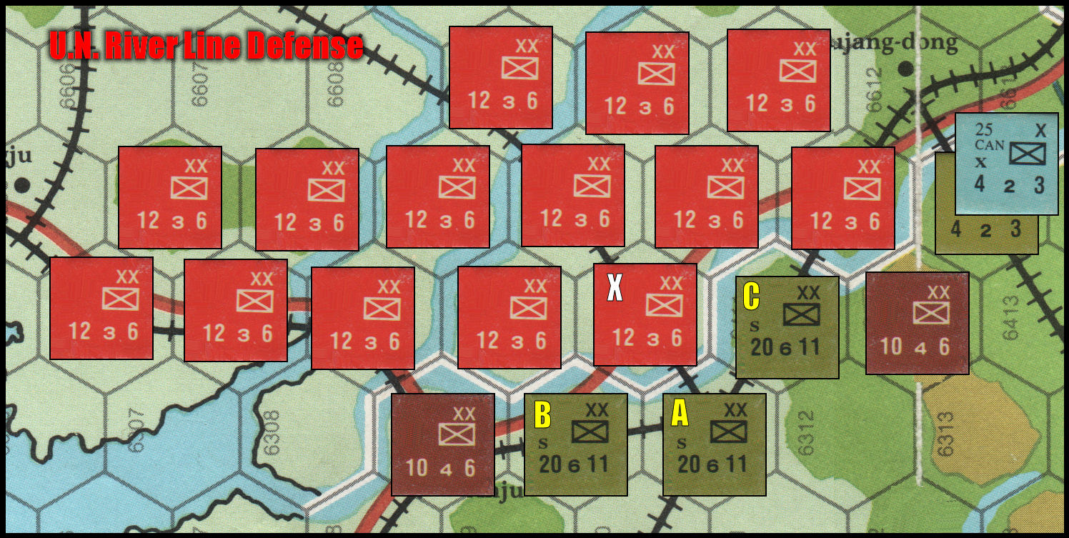 First of all, consider standard defensive tactics. If at all possible, every UN unit along the river should be entrenched, multiplying their defensive strengths by x1.5 or x2 (depending on the level of entrenchment). But a strong defense alone is not enough. Judicious counter-attacks must be initiated to further degrade the power of the very finite number of CCF divisions.