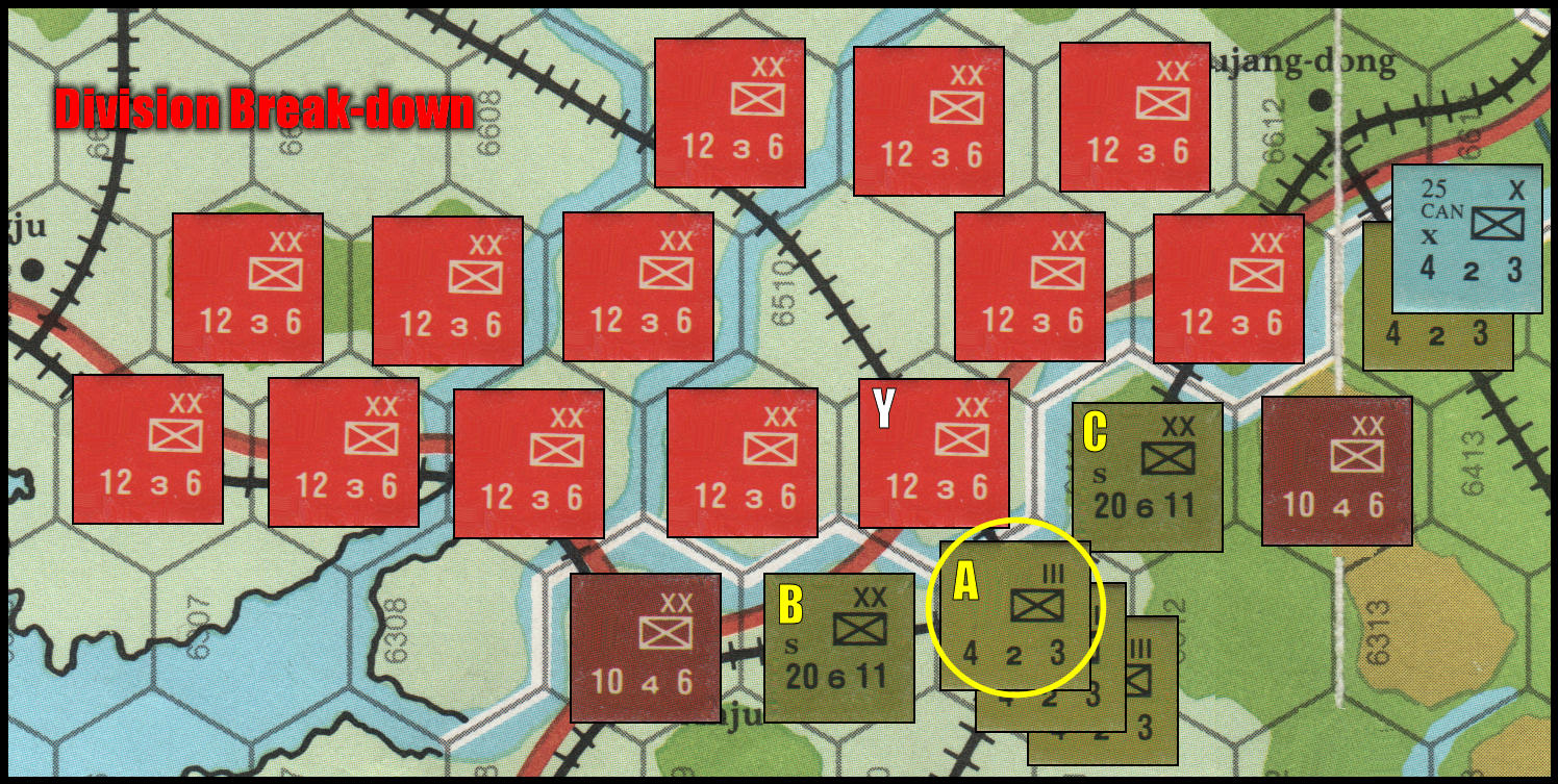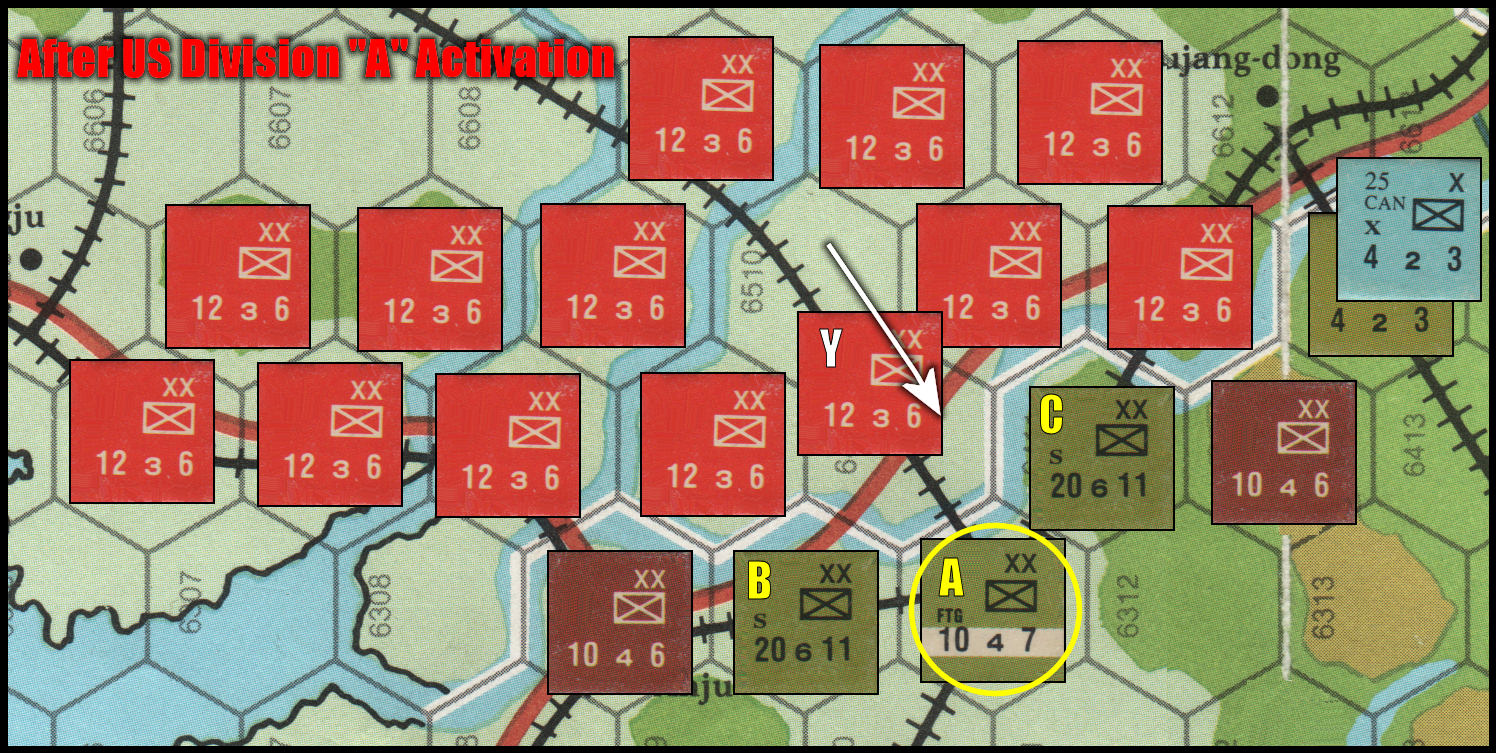 Let’s assume the CCF unit is totally destroyed by the attack, rather than taking just one or two step losses (division sized units are destroyed upon receiving a third step loss). Considering that the CCF divisions are stacked up all the way back to China, it’s not unreasonable to assume the CCF player will just move another one in to take it’s place (CCF division “Y”). And now the UN player is unable to repeat the attack as US division “A” is ineligible to activate again. He’ll have to activate either US division “B” or “C”, which will draw additional CCF units into the battle, while simultaneously suffering the disadvantage of having US division “A”‘s attack strength cut in half.