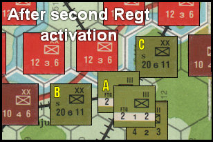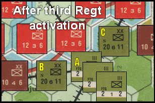 Now the first regiment in stack “A” can be activated, followed by the second regiment, and finally the third regiment. We’ve traded firepower for momentum.