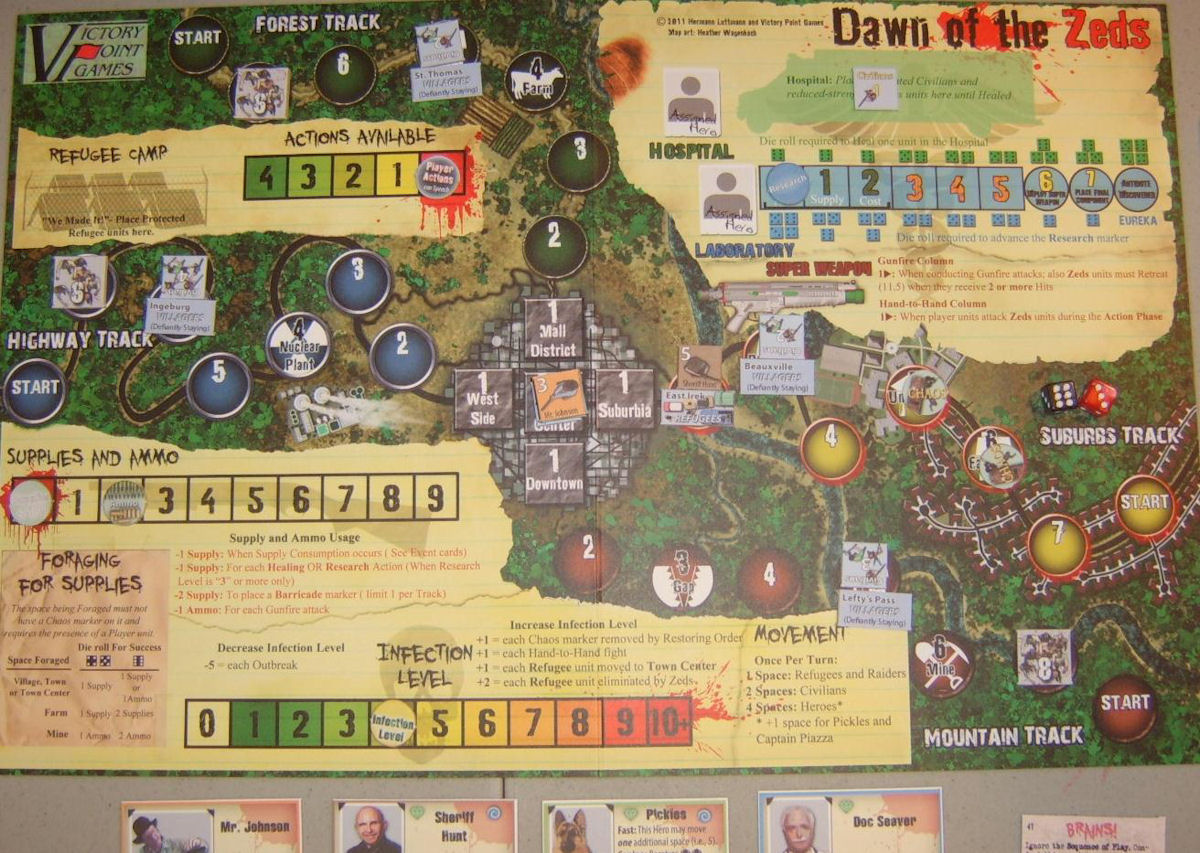 * Move our actions marker to the 3 space.* Let’s have the militia in Ingeburg open fire. They have strength 4. Deduct 1 from our ammo to bring it back down to 1. I roll 7 so I cause 2 hits to that Zeds unit. Place a 2 Dead Zeds marker on it.* I can’t really afford to move Pickles or Doc. I need ammunition!! Mr. Johnson forages and gets 8 so I get 1 ammo point! Increase our ammo from 1 to 2.* I have Mr. Johnson forage again. I roll 8. Since it is doubles I get the result of both dice and that would be +2 to our supplies. Bring that total back up to 11.* Sheriff Hunt now will move the Refugees into Suburbia.