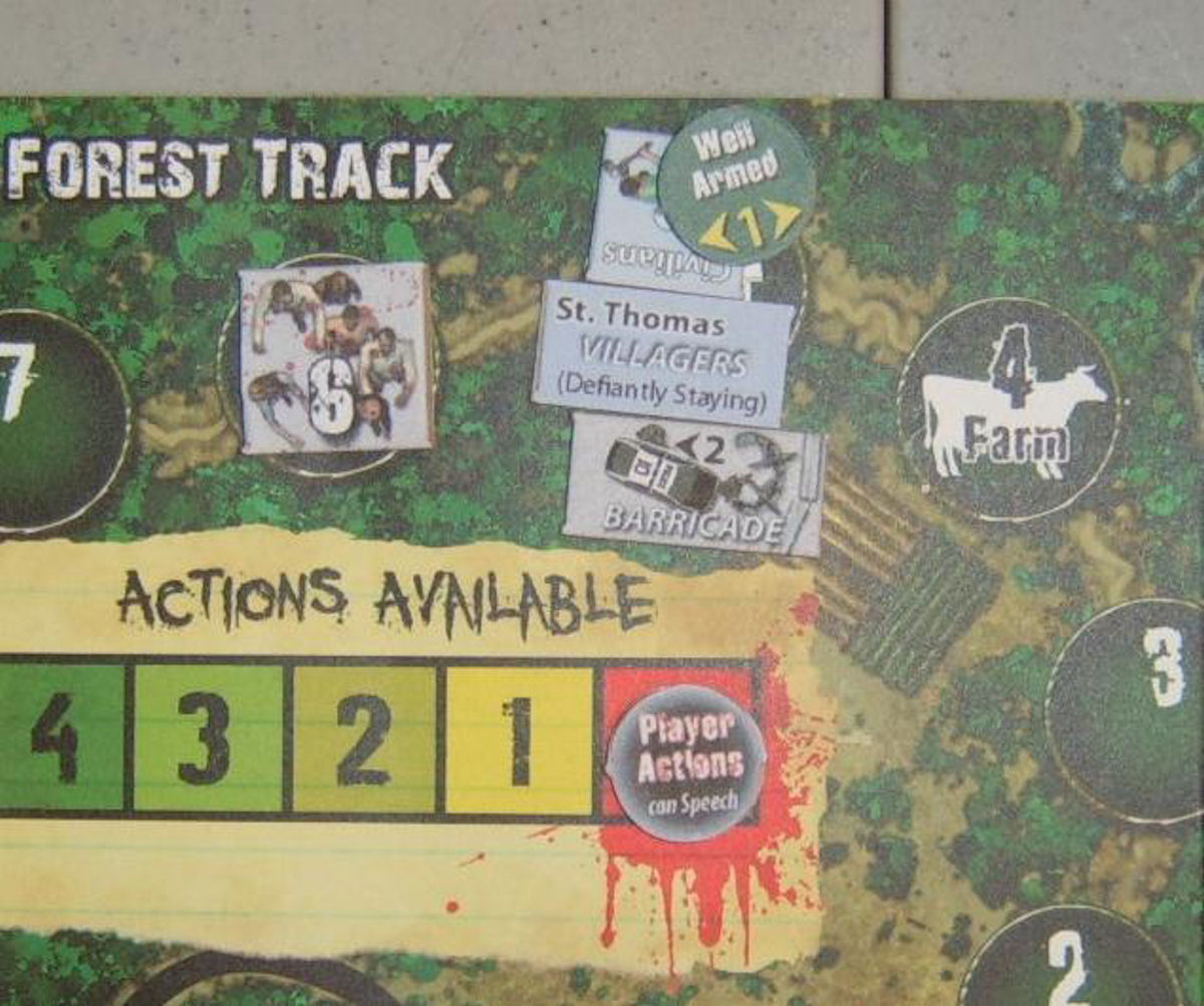 * Move your actions marker to the #3 space.* Move Hunt to #4 in the Suburbs.* Let’s fire on those undead! Deduct 1 ammo, now down to 1. I am adjacent so no Long Range penalty. I am firing on the 5 column. I roll 11! That’s a full 3 hits and will flip that Zed marker to its reduced side.* Ok, let’s put some barricades down in St. Thomas. With the well-armed Civilians there, this should be a stable fighting position for a while. Decrease supplies from 10 to 8 and put a barricades marker in St. Thomas. Instead of < 1 for defense, I now get a < 2 for the space. Also remember that you can only keep 1 barricades marker in play for each track.* Sheriff Hunt is going to have the Civilian marker in Beauxville forage for us. I roll a 5 and so my supplies are back up to 9.* It is the end of the Action phase and the Nuclear Plant space is NOT Zeds controlled. There are no toxic zombies!