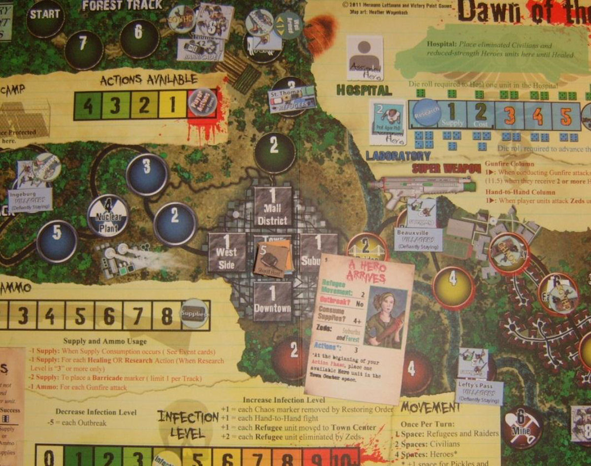 * Ok, I get a new Hero! Hmmm, I think I want to get working on that Super Weapon. I’ve been fairly lucky in keep Zeds away (though the Forest needs attention) so I am hoping Hunt alone can work on things. So let’s select Professor Agee. I put her marker down in Town Center.* Let’s move the Refugees one space closer to town and put them on #3.* Put Agee in the Lab* Move Hunt to Town Center. My plan is to move Seaver out immediately in the Suburbs if no Zeds appear so he can clear a Chaos marker or two. Hunt will be my back up for the Forest track. Since Hunt is back in Town, let’s have him direct a Civilians unit to do something for us. Let’s forage. I roll a 4 so I get 1 Supply. Move the Supply marker up to 9.