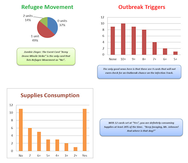 The Event cards drive your story and you draw a new one every turn. There are 48 total cards and 13 will help you, 30 are pro-Zed, and 5 could go either way.