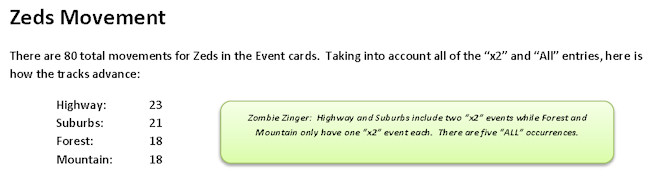 As for track location on the Fate cards, the most common is the Forest track (25%), followed by Mountain and Suburbs (20% each). This might make up for their slower speed on the Forest and Mountain track. There is one each for where Zeds are strongest and for Player’s Choice.
