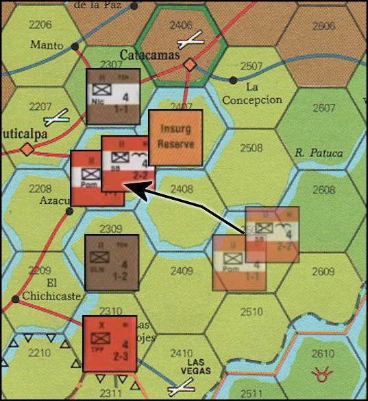 During the Ground Combat Phase, the Communist player decides to attack the FDN battalion in 2309 with the Nicaraguan brigade and the special forces unit. The combined Attack Value is 4 (2 + 2 = 4), which results in a 2-to-1 combat odds against the FDN unit. The Communist player receives a one-column shift for the special forces unit and a +1 die roll modifier because it is an insurgency unit. The combat results in the FDN being eliminated, and the Nicaraguan brigade pursues into the vacated hex.