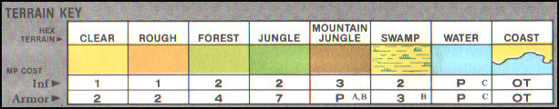 In ground combat, basic combat odds are calculated in a standard fashion (1-to-1, 2-to-1, 3-to-1, etc.) and then the “Initial Combat Ratio” marker is placed on the proper odds column of the Ground Combat Table, in the row that matches the terrain where the defender is located. Terrain effects are built right into the table. For example, the Initial Combat Ratio marker would be placed in column 11 for a 2-to-1 attack in Clear terrain, but would be placed in column 8 for an attack upon a defender in Jungle terrain. The higher numbered columns yield better results for the attacker, thus demonstrating that a defender’s odds are better in Jungle terrain than Clear.