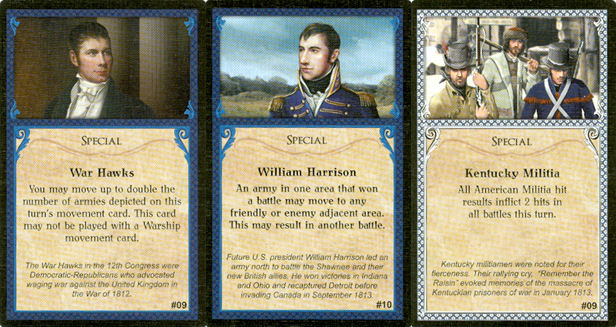 The William Harrison card will allow one force that makes a successful attack to attack again into an adjacent area thus possibly gaining another victory point objective. The Kentucky militia card is best played when several decisive battles are about to be fought in the same turn since its effects apply to all battles in the turn.