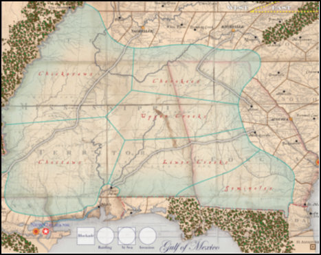 The American player strategy can be even more bewildering. He has a large northern frontier to defend, a long and exposed coastline and the potential for civilized Indian tribes to become Belligerent in his rear areas. Moreover, the British can open up another theater in the Northwest Territories by play of the Indian Nation card. Additionally, his Great Lakes ports are poorly fortified, some Major cities are vulnerable to attack and he has few Regular units to oppose the well-trained British Army. And if that is not enough, he must prosecute the war with truly inept leaders!