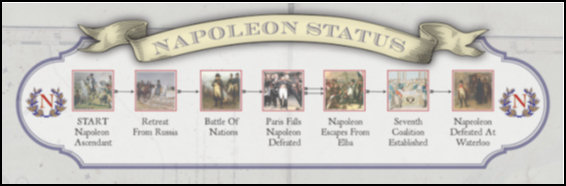Napoleon cards represent the rise and ebb of Napoleon’s career. When Napoleon Suffers a Setback is played, a marker is moved down the Napoleon status track. The location of this marker affects various other events in the game including British commitment to the war and the flow of British Army Regulars to the North American continent. It also can cause Peace Track movement for the British player. In one simple mechanic, the designers have admirably portrayed the effects of the European war on the British and American conflict.