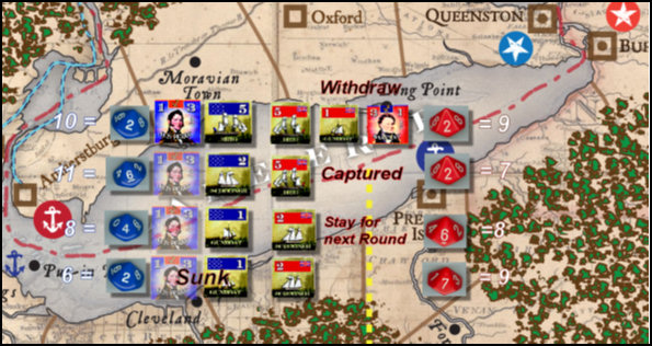 Both sides have ships remaining on the lake in their expeditions. Since the British are the defenders they first decide whether they will remain on the lake to continue combat or withdraw to a port. They correctly decide to withdraw since they are outnumbered and the American player has some higher-rated ships with a tremendous advantage in tactical leadership now that Barclay has withdrawn. The combat ends with the American ER expedition in control of the lake. Oliver Hazard Perry’s sends his famous message to Congress, “We have met the enemy and they are ours!”