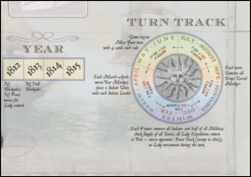 Next, if this is a winter turn, several tasks are completed. The British must remove all Indians. Then players remove half of all their Voluntary Militia rounded down. Then supply is checked for all units resulting in the elimination for any units unable to trace. Finally all Lake Expeditions presently on the Great Lakes return to a friendly port or harbor. Starting in 1813, this will trigger Peace Track moves and is an important way of reducing your opponent’s will to fight.