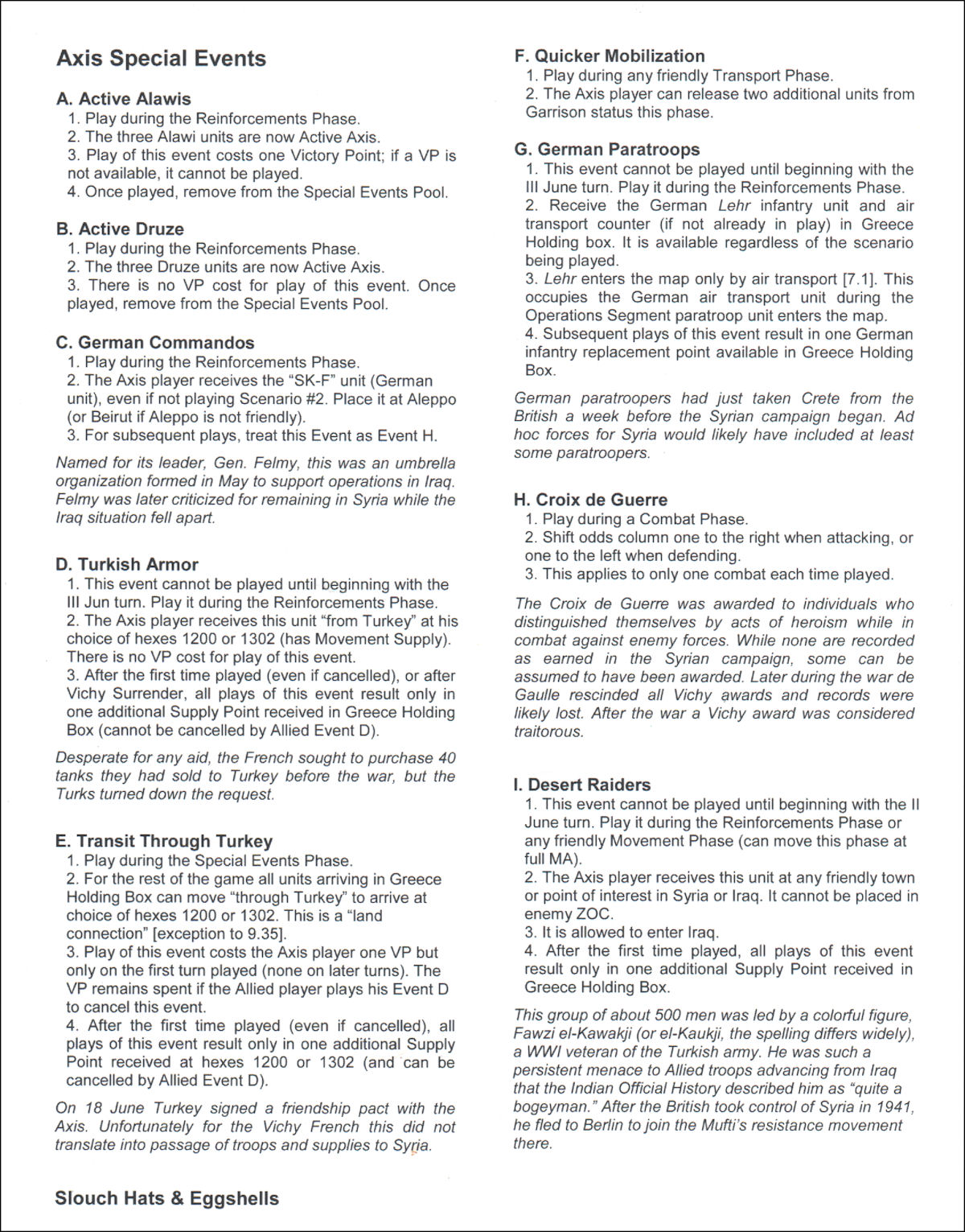 Unlike many games that have “special events” or “random event chits”, I consider the Special Events in Slouch Hats & Eggshells to be an integral part of the game design, not just ancillary occurrences to provide “flavor” or random-ness(?). The Axis and Allies have 18 possible Special Events each. Some give reinforcements, some provide intelligence, and others add combat bonuses. They illustrate events that did occur, or could have occurred, during the conflict. The variability furnished by 36 total events, and the uncertainty of which ones will occur when, does add a lot of replay value to the board game.