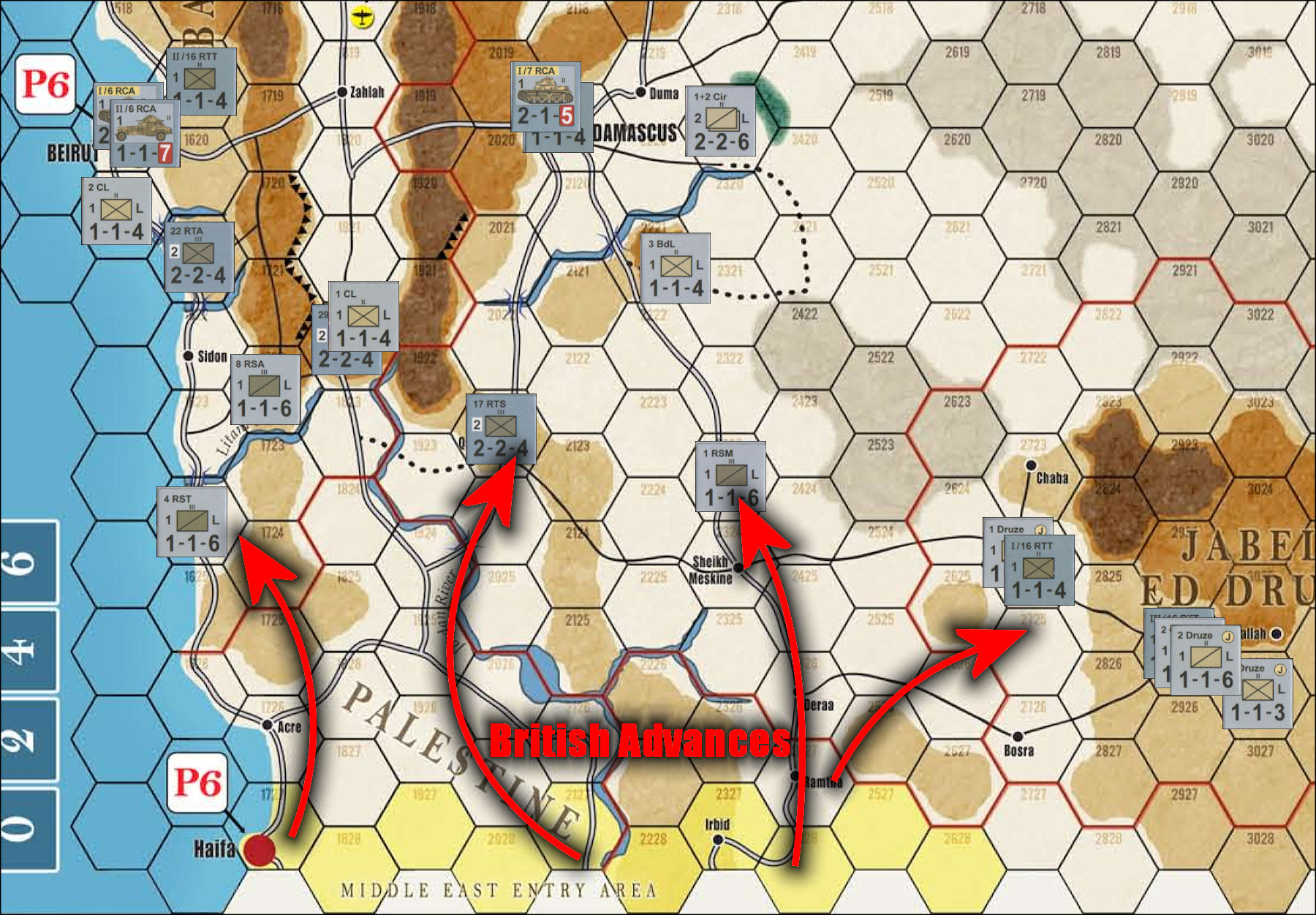 Relatively short interior lines of supply in the south give the Axis their biggest advantage, but the eastern desert is wide open to the Allies and is difficult to defend. The Axis player, with his thin line of defenders in the east (note the smattering of defending Axis units in the graphic, above, and the variety of axes of advance for the Allies denoted by the red arrows), must have the patience to confirm the main Allied lines of attack coming westward out of Iraq, before shifting his Vichy defenders to counter the threat.