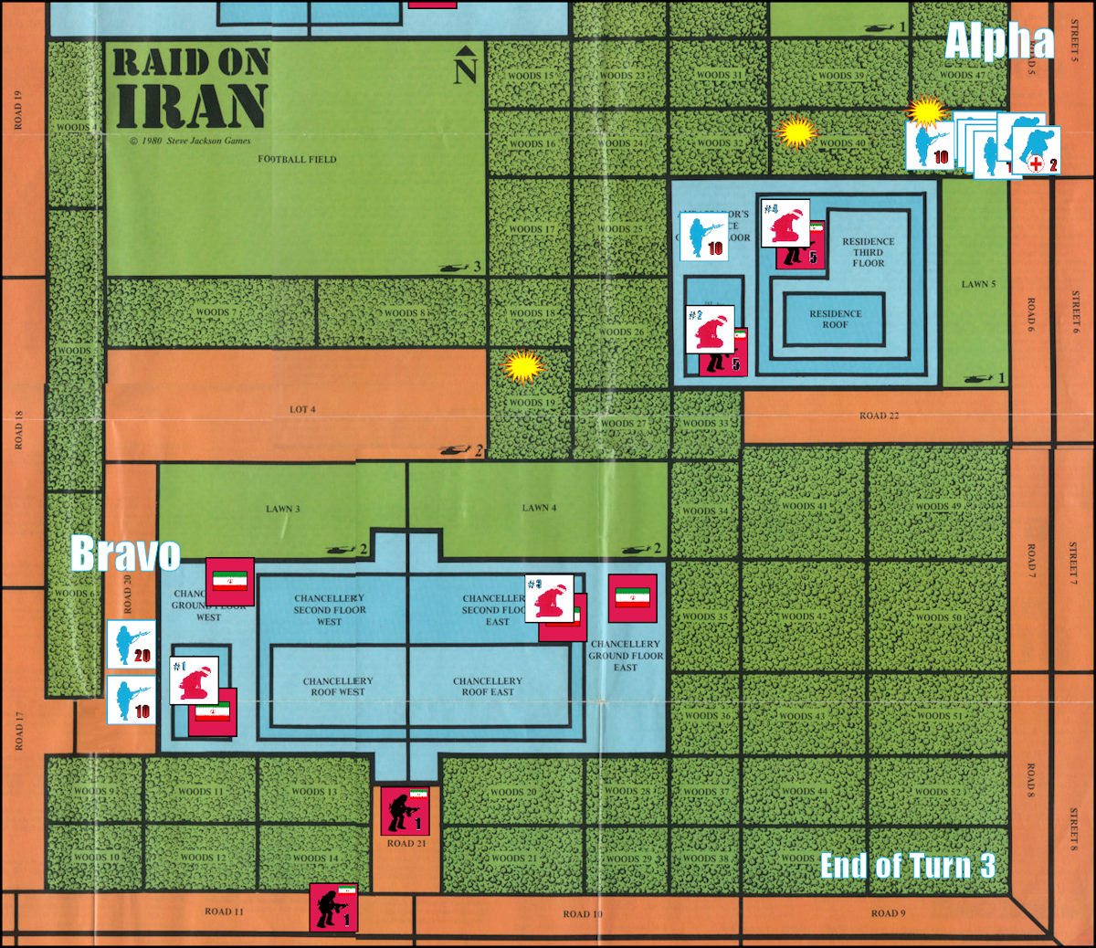 - 30 commandos designated as “Bravo”, will attempt to use deceit to transit the front gate disguised as a supply convoy and move via road to the Chancellery. A bold move, indeed. They will have to fool the main gate sentries as well as the individual sentries in Roads 17 and 20. (Note: There are no “supply truck” units in the game; the commandos are just assumed to have local help in procuring the trucks and helping with the deception, but not the super-duper expert help they’d have if they had chosen the “Farsi Speakers” option)