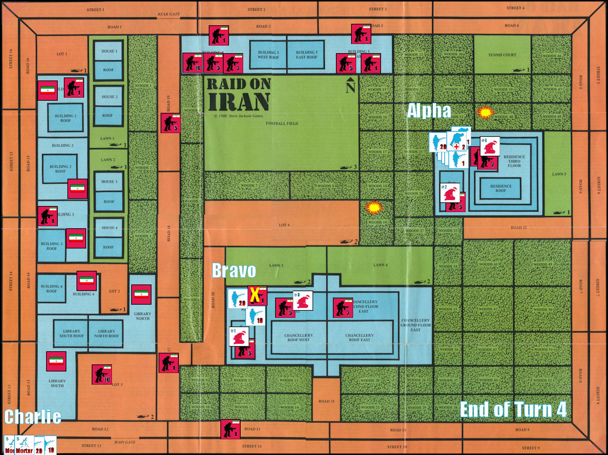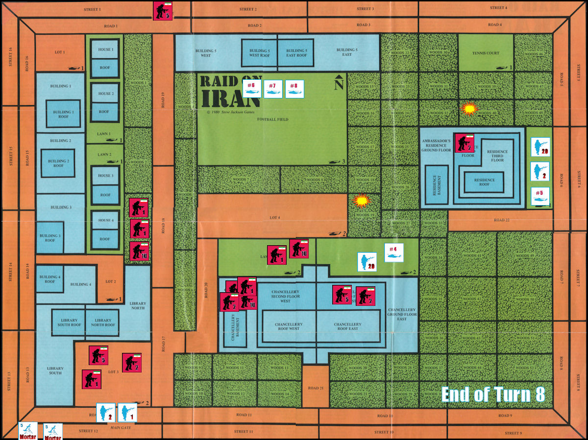 During this turn, all the remaining commandos outside the Chancellery and Residence board helicopters and safely evacuate. The 3 remaining mortarmen opt for a “Ground Evacuation”, performing a double-move to make it outside the compound, and are assumed to have been spirited away by friendly agents inside Teheran.