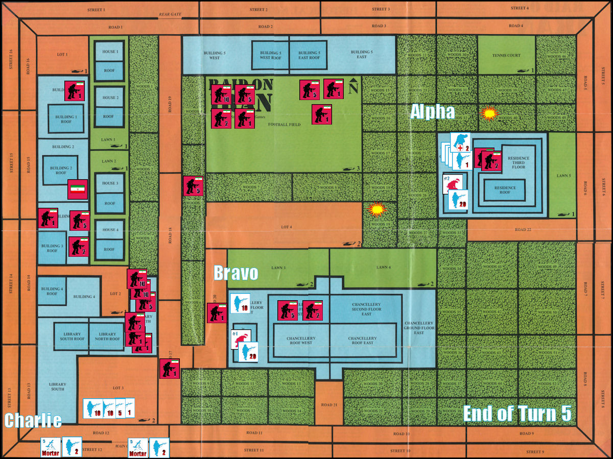 The American mortars boom for the last time as they attempt to silence the 5 militants in Lot #4, who are the only militants at the moment who can physically interfere with the Chancellery LZs. The die roll is “6” which causes the elimination of all 5 militants. (Is anyone else keeping track of the luck the American player is having today?) There’s no other Ranged Combat because all the commandos need to be able to move toward the helos this turn, and the one allowable double-move is being reserved for the Bravo element and the 25 hostages under their care.