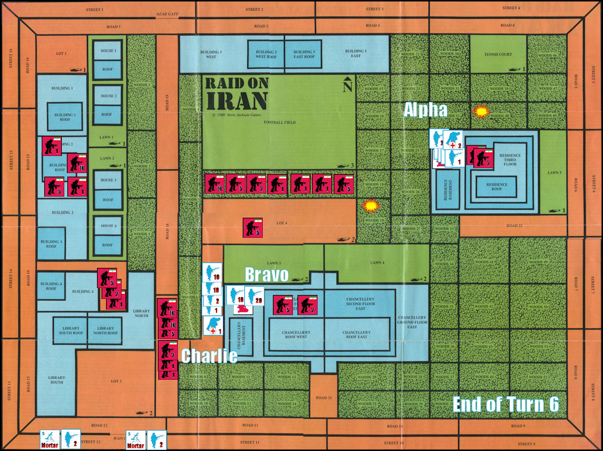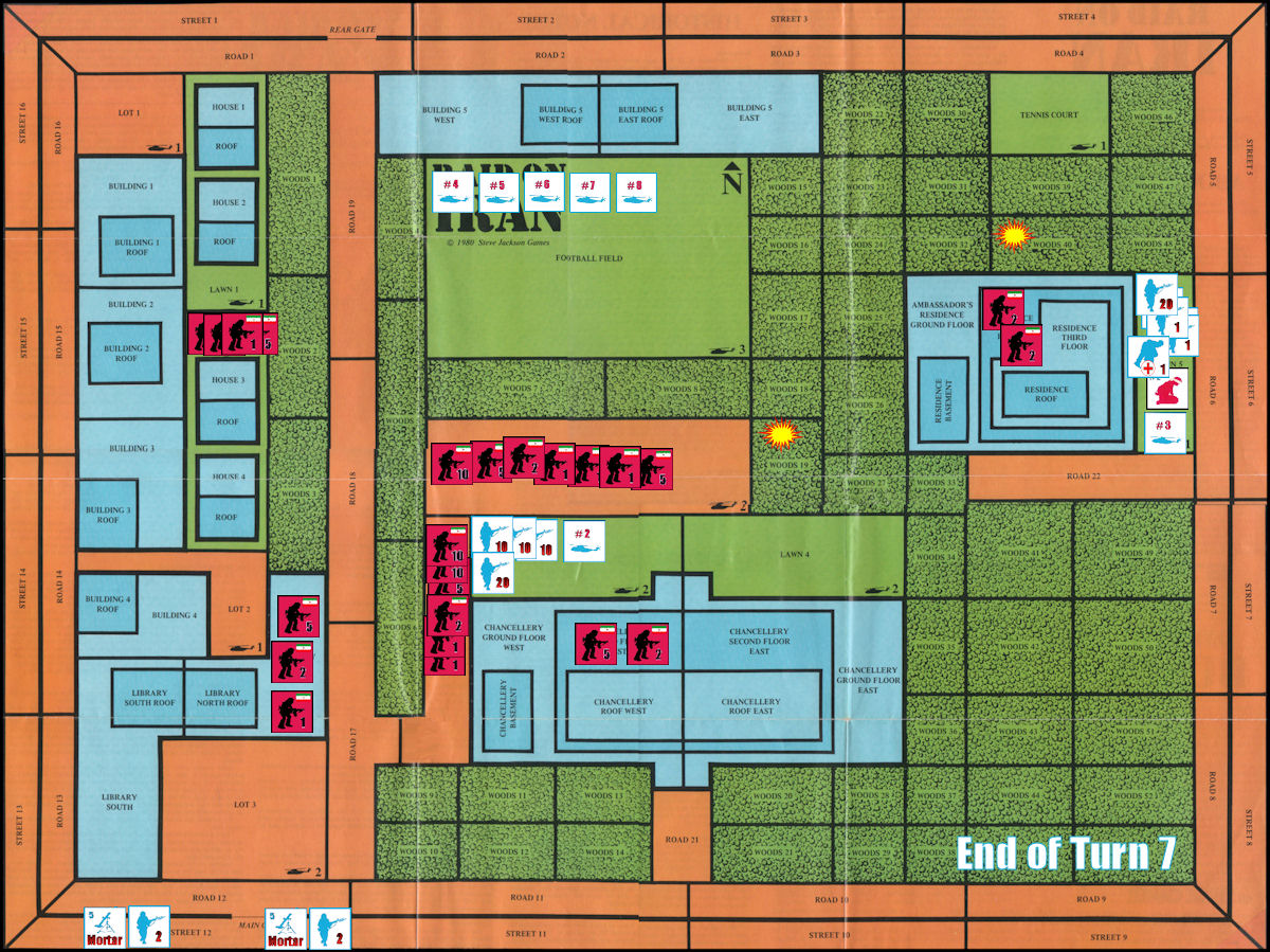 Turn 6 ends with all American commandos positioned to board the helicopters that are scheduled to arrive on Game Turn 7 (but remember that the Iranian player doesn’t know this), and with 60+ militants bearing down on the Chancellery and its vulnerable helicopter LZs.