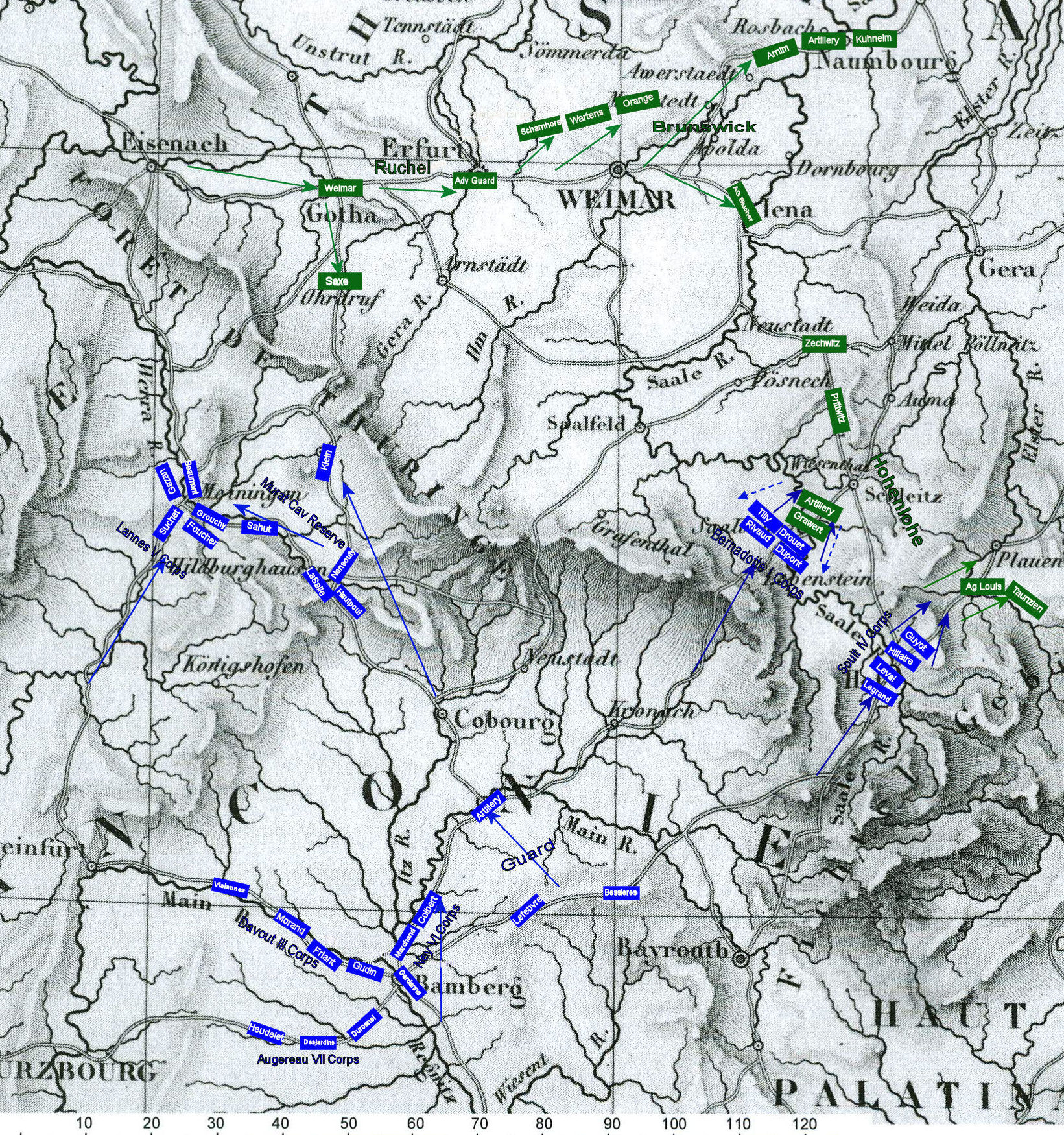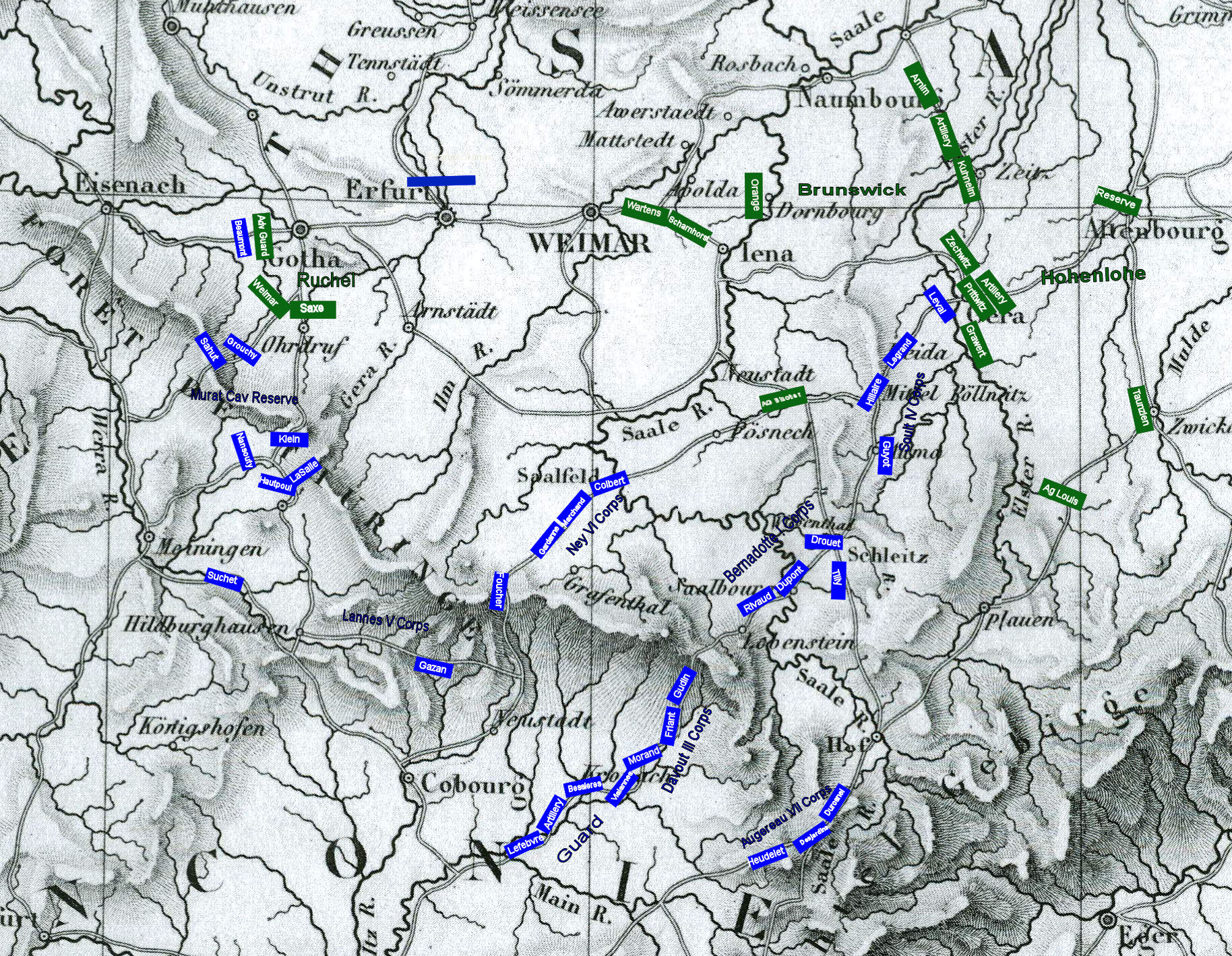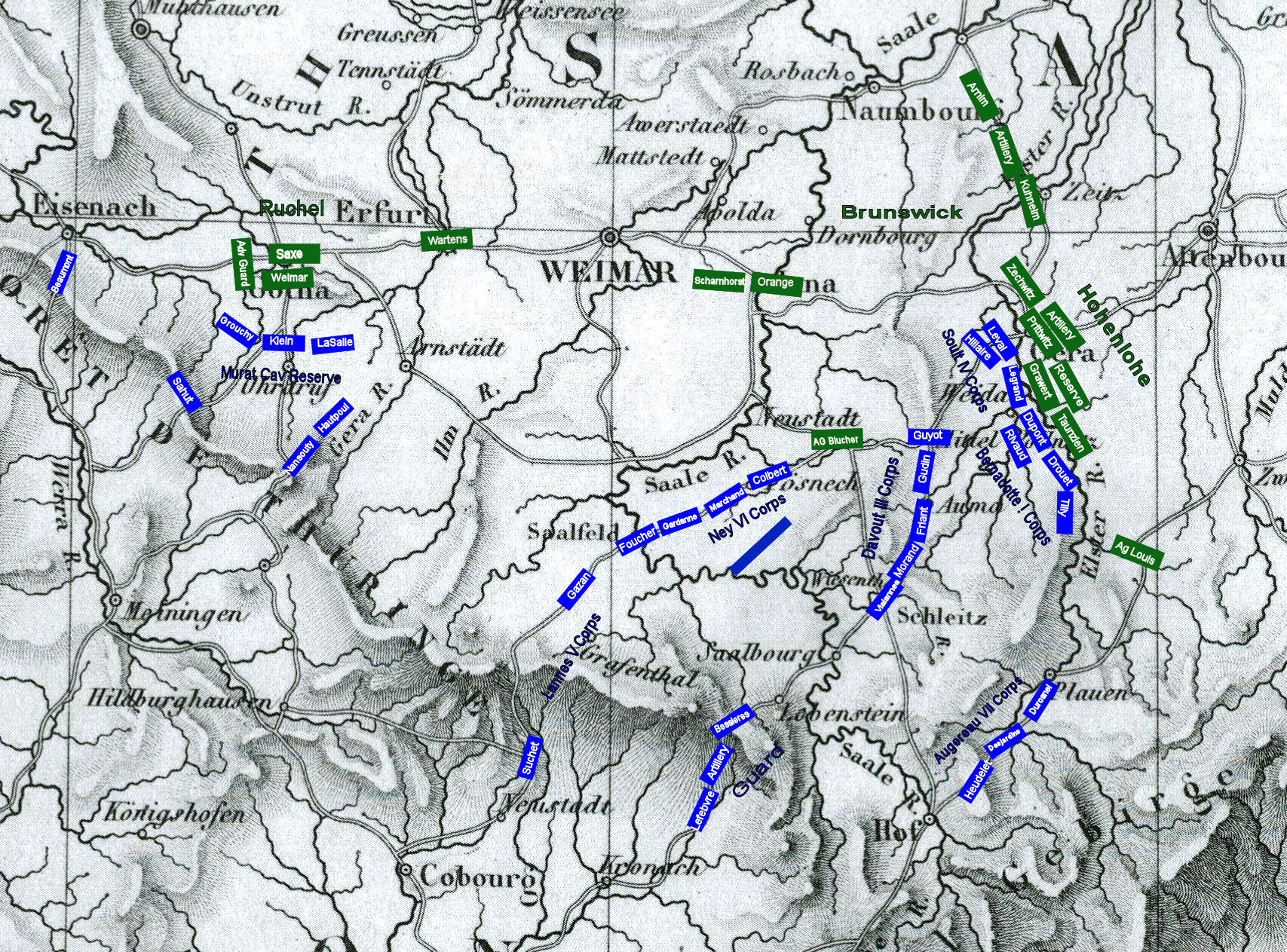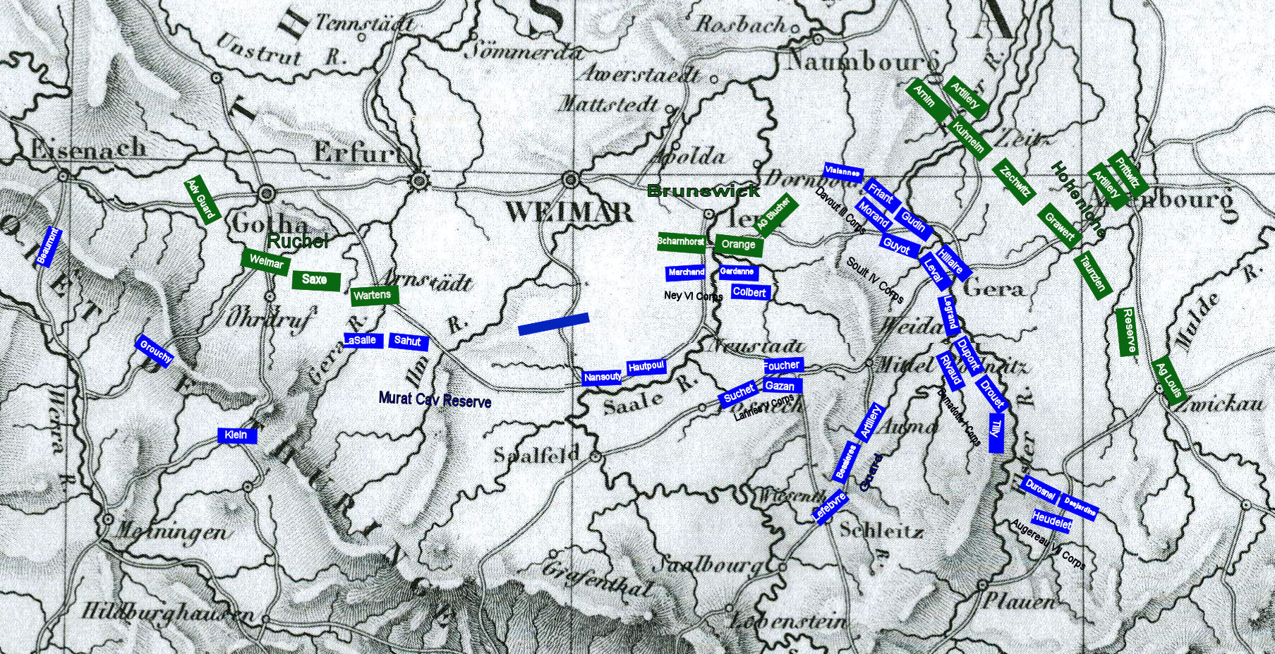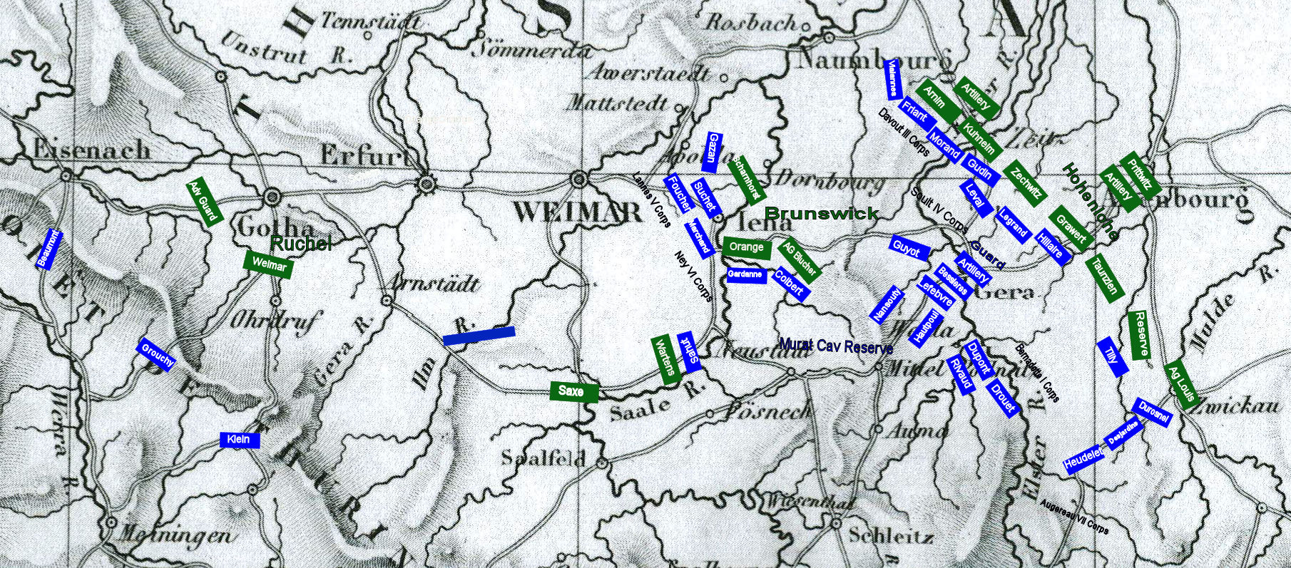 The army will aggressively cross the Foret De Thuringe range and concentrate in the vicinity of Gera with the aim of bringing the main Prussian army to decisive battle in the Weimar-Altenbourg-Leipzig triangle. The point of greatest danger will be while crossing the Thurignen passes. The cavalry corps, with support from V Corps will demonstrate to the west near Gotha to fix the enemy’s attention while the bulk of the army moves northeast toward Gera. The cavalry corps and V Corps will avoid decisive engagement by the enemy and once the main body has crossed the Thuringen hills, they will march east to become the army’s reserve.”