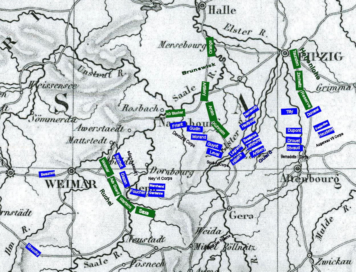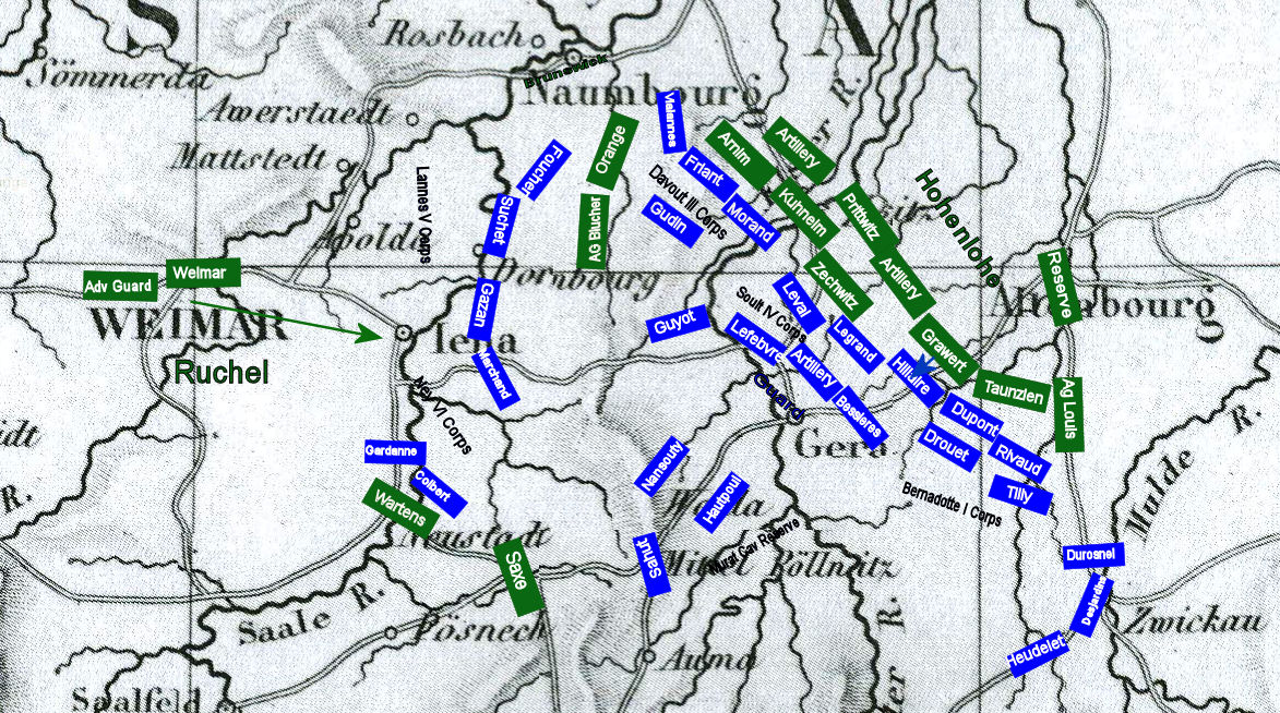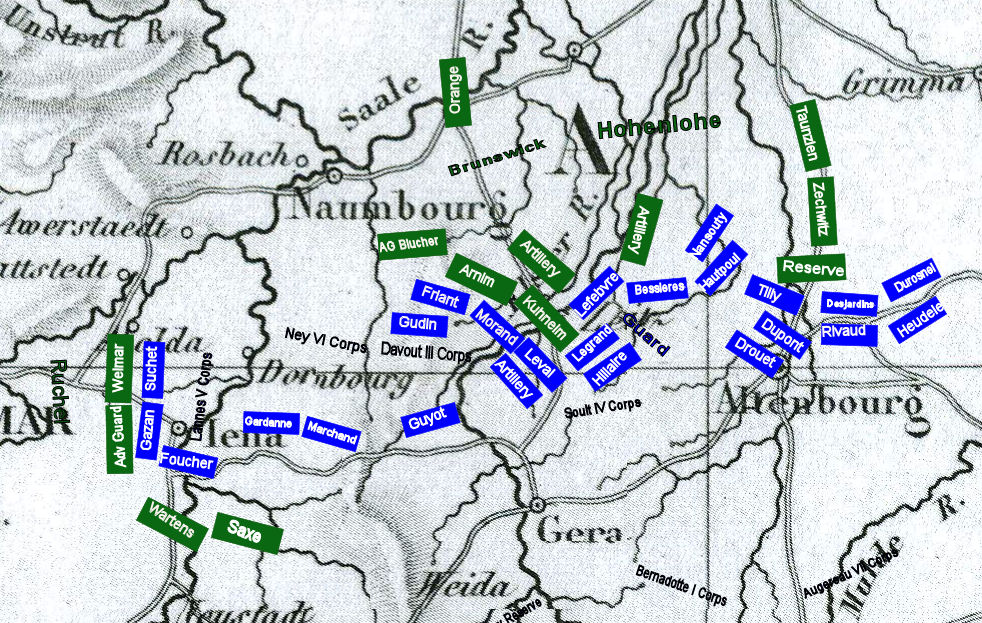 HohenloeHohenlohe again hesitates to attack and orders a general withdrawal during the night. This increases the distance between his commanding officer, the Duke of Brunswick’s forces. He also abandons an extremely strong defensive position along the Elster River. He forms a line slightly to the Northeast but he does not withdraw far enough that the French will not be able to catch him the next day. In essence he has given up a very defensible position and has ceded the central position and the initiative to the French. The retrograde movement greatly increases his lines of communication to Brunswick. The French are now able to shift forces and get messages back and forth within their own lines in a matter of an hour or two but Prussian communications follows a circuitous path through Naumbourg taking more than 12 hours for two-way communications.