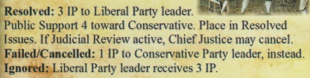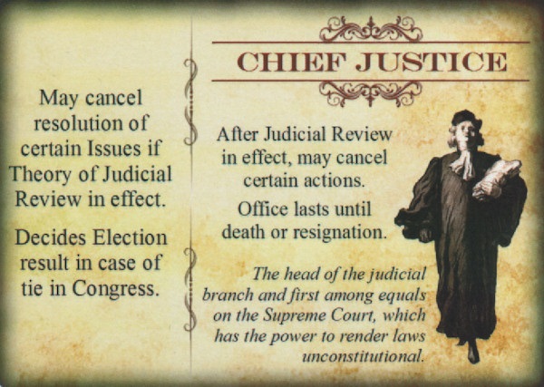 The Issue card lists the rewards/penalties for resolving/failing to resolve the Issue. If successfully resolved, the Liberal Party leader (Jefferson) gets 3 Influence Points, representing the political “hay” he can make by broadcasting the un-constitutionality of the Act. But the Conservatives will gain significant Public Support. If it fails, Conservative Party Leader (Adams) gets a 1 Influence Point “consolation prize”. The President also has the option to just “Ignore” the issue, but that will give the Liberals the same benefit, but would deny Conservatives their Public Support shift. Finally, notice that there is a Cancelled option too. This means that John Jay, the current Chief Justice (and Conservative) can simply make this issue go away.