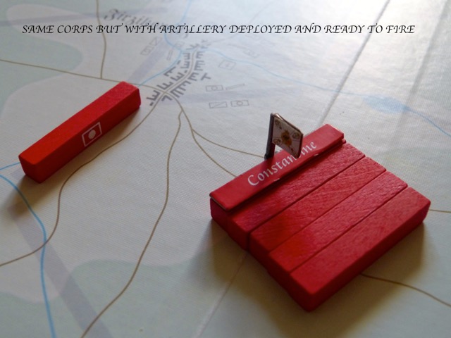 What then of Simmons’ approach? This could be described in various ways, but to my mind the map and blocks of all three games could be described as having the look of something you would find set up in some bygone commander’s tent on the eve of the decisive event.  Alternatively, you could describe them as the three dimensional realization of a Nineteenth Century map of any of the given battles. In all three games, one side has red blocks (actually, thin rectangular wooden pieces) and the other, blue. The military pieces of the two Napoleonic games are identical; but there is an important extra element in the Napoleon’s Triumph game in the shape of flagged leaders on metal stands. These are not “personality” leaders with ratings (or tempers), but administrative extras for that bigger battle, whose precise role we will look at a little later on. Just for now, it is worth adding that they do make their own contribution to the overall visual effect, which, putting the whole thing together, blocks, leaders and the map, has a certain restrained, minimalist beauty which subtly matches the way in which both this and the other designs play out.