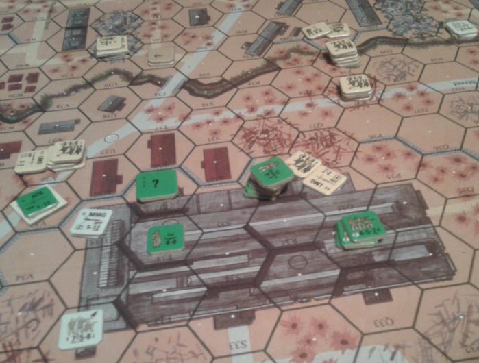 Each player had 800 points. In my case, that translated into about 25 or 30 counters, including support weapons and leaders. I am not sure what losses other players suffered, but I only lost two squads the entire game, although at times had half a dozen or so trying to regain morale from artillery and mortar strikes. About a third of my troops at the three-story building never moved, content to be a fire base that hammered away at Dennis and Allen with HMG, MMG, and mortars and denied access to the relatively open no man’s land.