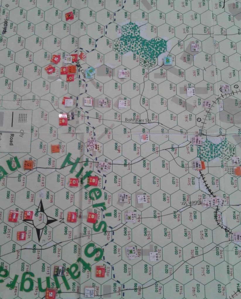 As we went through the third turn, Marc started to figure out that his ground attacks were going in without artillery support — not really a problem per se, since he was maxxing out the CRT, but, with artillery support, he could almost double the number of attacks. And if there’s one thing the Soviets want to do is cause lots of German casualties in the suburbs and prevent any wholesale German withdrawal to the city proper (as defined by a railroad ring that the Germans had half turned into fortified areas).