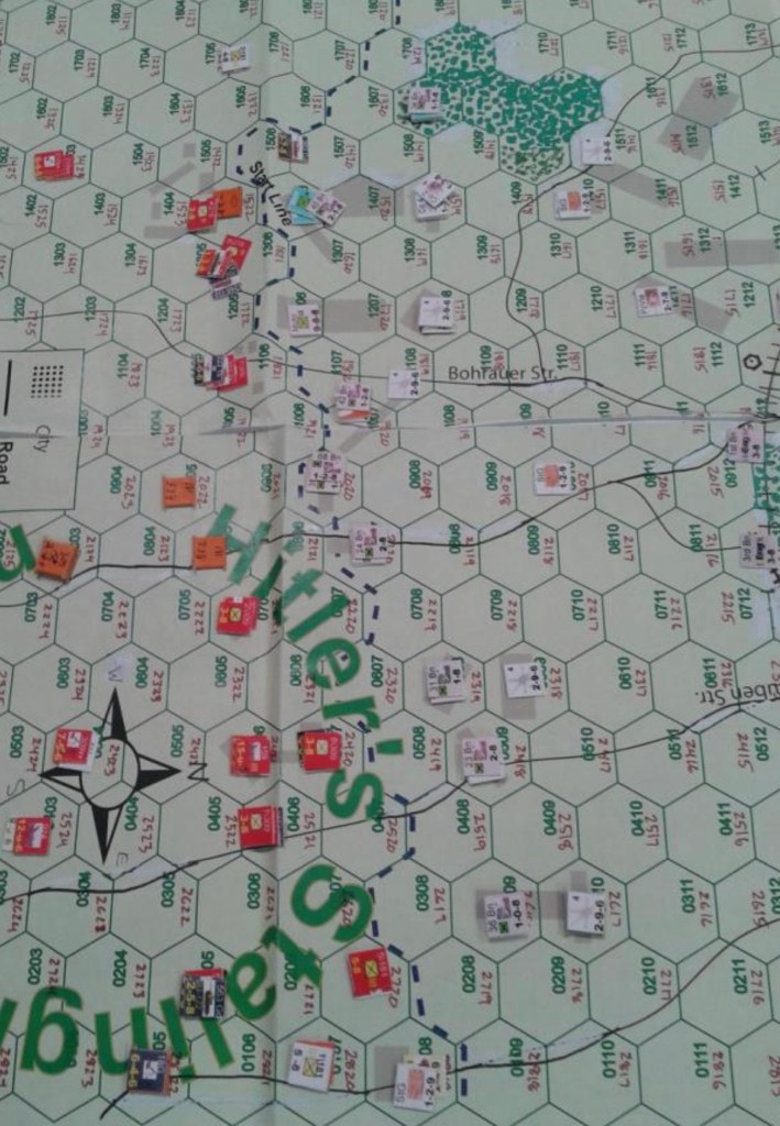 Not that there is a lot of cover next to the initial German defense line. Yet, he mounted a few massed attacks against the German defense line. He eliminated a unit here and there, which allowed me to point out rules mechanisms as we went through the turn sequence. You could see multiple light bulbs turn on as we went through the phases, and presumably ran WWII history in his head.