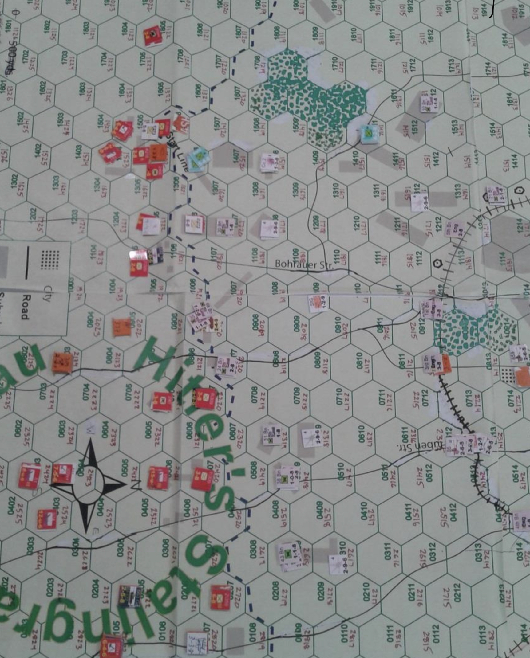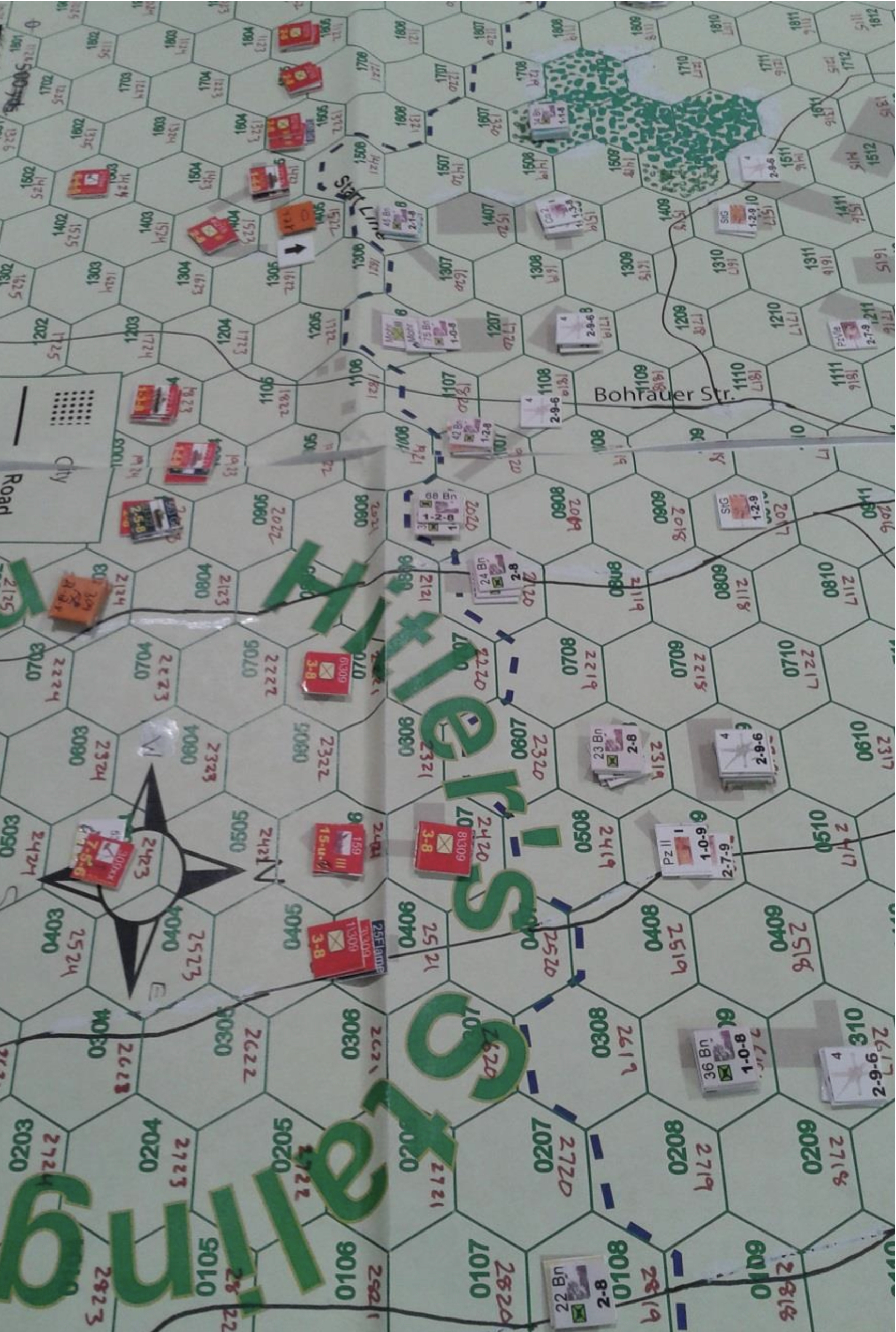 As we went through the third turn, Marc started to figure out that his ground attacks were going in without artillery support — not really a problem per se, since he was maxxing out the CRT, but, with artillery support, he could almost double the number of attacks. And if there’s one thing the Soviets want to do is cause lots of German casualties in the suburbs and prevent any wholesale German withdrawal to the city proper (as defined by a railroad ring that the Germans had half turned into fortified areas).
