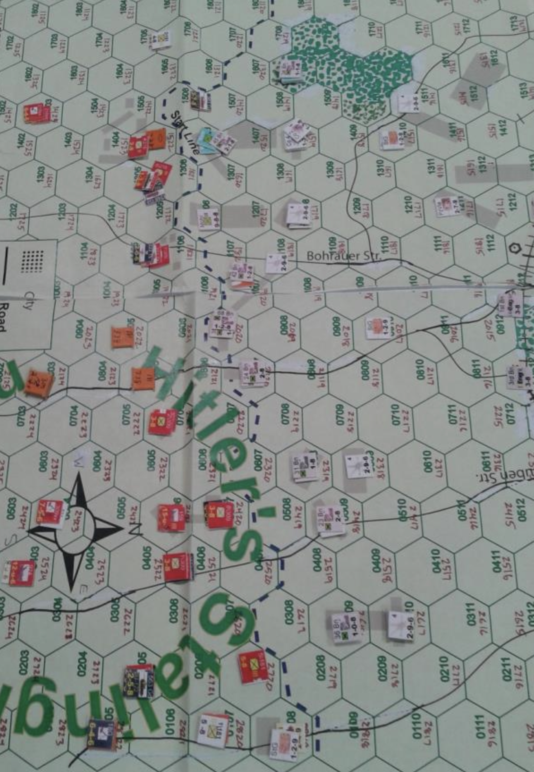Not that there is a lot of cover next to the initial German defense line. Yet, he mounted a few massed attacks against the German defense line. He eliminated a unit here and there, which allowed me to point out rules mechanisms as we went through the turn sequence. You could see multiple light bulbs turn on as we went through the phases, and presumably ran WWII history in his head.